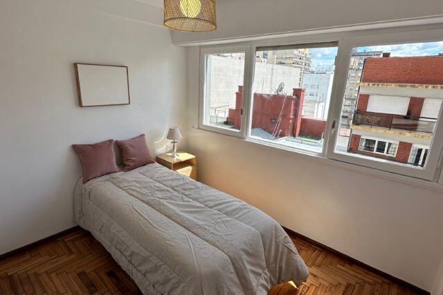 Dormitorio secundario a la calle con piso de parquet plastificado, sommier de 1 plaza, placard y gran ventanal.