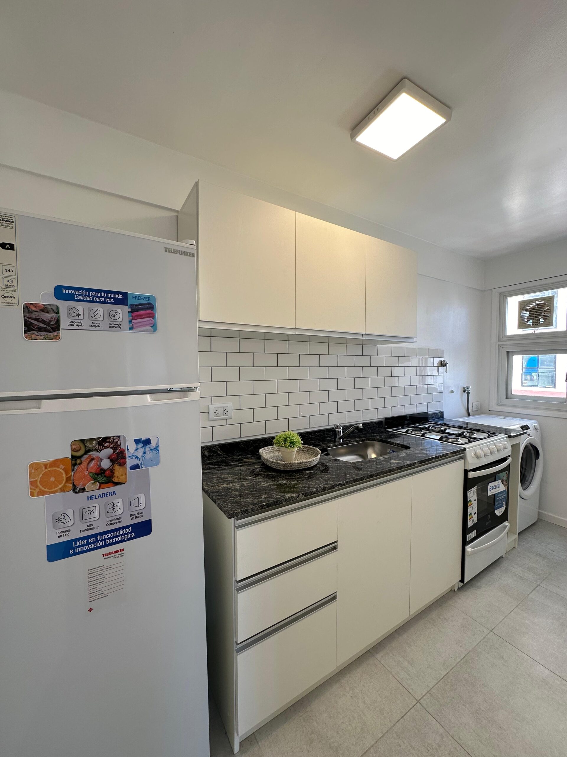 – Amplia Cocina revestida en porcelanato. Amoblamiento de cocina a medida, heladera con freezer, lavarropa, termotanque eléctrico y cocina a estrenar.