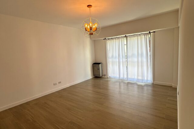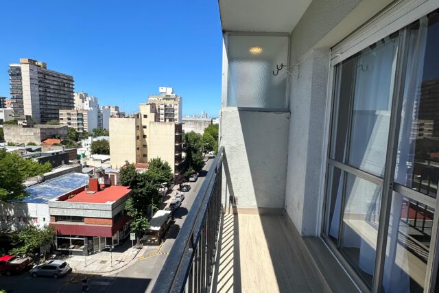 – Living comedor a la calle con balcón saliente, piso de porcelanato y calefactor.